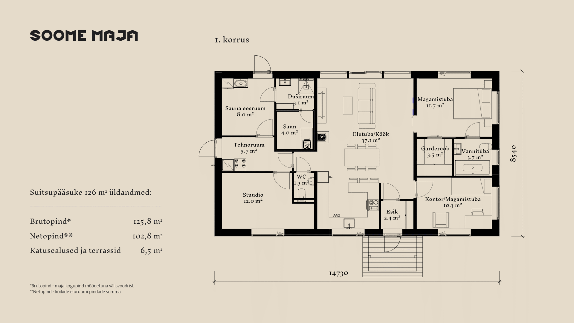 See armas Suitsupääsuke majaprojekt on eriline oma elutoas laiuvate suurte loft-stiilis akende poolest. Tänu nutikale planeeringule on selles majas lisaks ruumikale, osaliselt eraldatud kööginurgale veel 3 magamistuba, millest üks on oma garderoobi ja vannitoaga. Lisaks on veel saun + duširuum, eraldi majapidamisruum ning hulgaliselt hoiuruumi.
